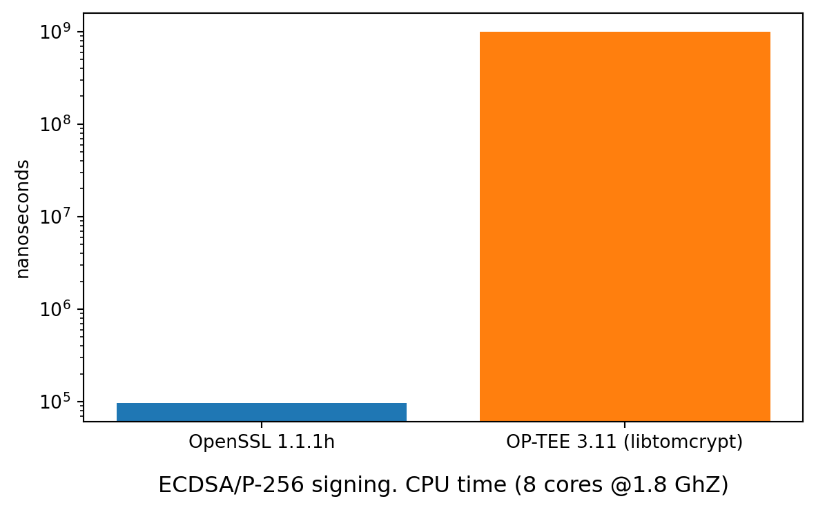 [id-ecPublicKey]Seems engine can be loaded correctly. Now, when OpenSSL tries to sign a message it needs to do a call to TEE (which is an SMC call to switch CPU into the secure world), get a key from secure storage and return the signature. Also, a crypto operation is now not done by OpenSSL, but by crypto library provided by the OP-TEE OS (in this case it is a fork of LibTomCrypt). All in all, there is a cost of all that dance. Measuring this difference will give some idea and also is a good way to check if the whole flow works correctly. That is done by speed.cc located in the project’s repository. Benchmark runs 2 functions, the SignREE performs signing, fully in the Normal World by calling pure OpenSSL implementation and SignTEE uses optee_eng for singing. I’ve got the following results when running it on HiKey960 (ARM Cortex-A73).