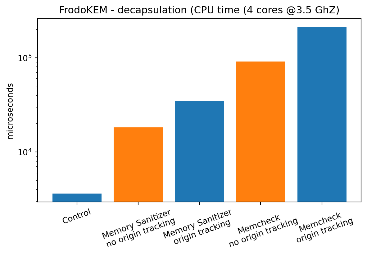 The graph below shows execution time difference when running FrodoKEM decapsulation without any instrumentation, with compile-time instrumentation Memory Sanitizer and then runtime instrumentation done by Valgrind’s Memcheck. The origin tracking is pretty expensive, so separated results are shown for a run with those enabled and disabled.