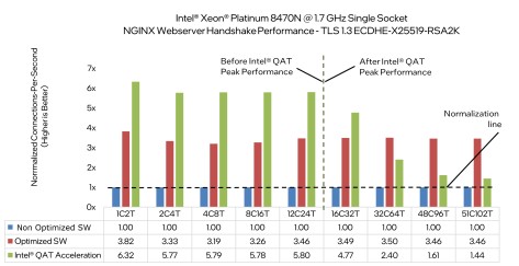 The conclusion that is particularly interesting is that QAT throughput for TLS saturates beyond 16 cores for RSA2K/ECDHE-X25519.